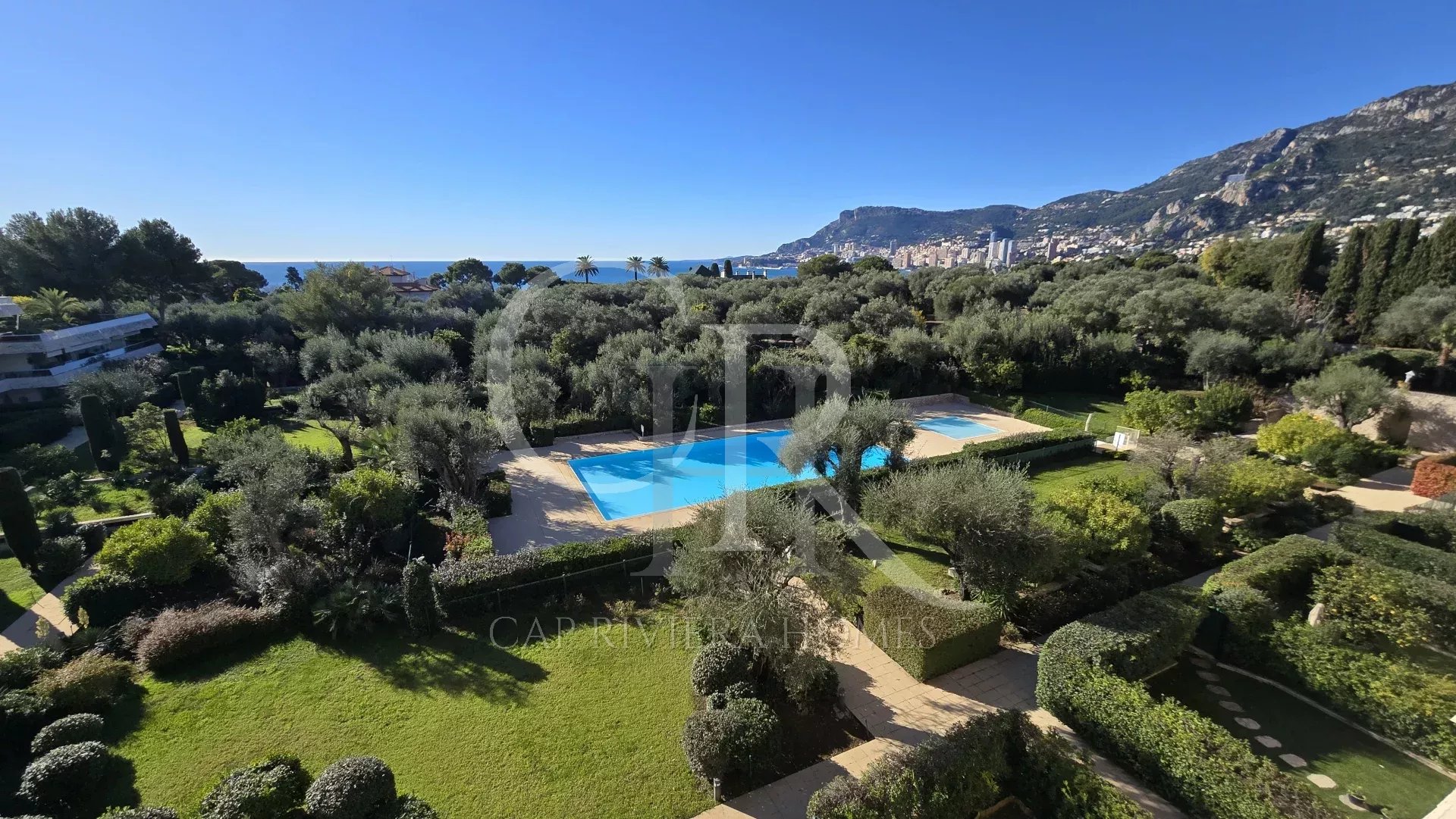 Magnifique 5 pièces traversant avec double salon, 4 chambres en suite avec SdB, cuisine équipée, terrasse circulaire avec vue mer et Monaco.